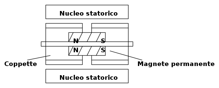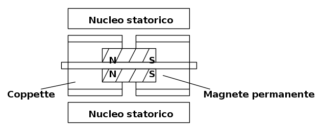 Tratterò con più attenzione questi motori in quanto sono i più diffusi sul mercato. I vantaggi di questo motore sono; la capacità di mantenere la sua posizione anche in assenza di alimentazione degli avvolgimenti statorici, e la capacità di assestarsi rapidamente in una posizione di equilibrio. Svantaggi sono rappresentati da l'elevata inerzia causata dal peso del rotore in materiale ferromagnetico e il costo del magnete permanente. Il rotore è costituito da un magnete permanente, magnetizzato assialmente. Questo a sua volta è ricoperto con una struttura cilindrica di ferro-silicio dentata. Per via della polarizzazione si vengono a creare due sezioni rotoriche (chiamati in gergo coppette), magnetizzate con con poli opposti.