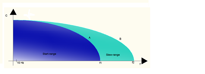 La curva A rappresenta il valore di coppia sincronizzante, che è il massimo valore di coppia di carico che può essere applicata al motore ad una data frequenza nella fase di partenza. Oltre questa linea si ha la perdita di qualche passo. La curva B rappresenta la coppia sincrona. Lei rappresenta il valore massimo di coppia applicabile a un motore già in movimento a una data velocità senza che quest'ultimo perda nessun passo. Si tratta di una coppia non influenzata dall'inerzia del rotore-carico ma dallo smorzamento. Le aree start-range e slew-range rappresentano i valori accettabili di coppia sincronizzante e sincrona. Come si evince più la frequenza aumenta, più si richiedono variazioni veloci della corrente, più la f.c.e.m. la fa da padrona fino ad azzerare la corrente e quindi la coppia. La frequenza f1 è la massima frequenza alla quale il motore a vuoto può partire senza che perda il passo, la f2 è il valore di massima frequenza alla quale il motore può ruotare senza perdere passi. Il valore di 10 Hz come valore iniziali (valori di riferimento variabili da motore a motore) son dovuti dal fatto che a basse frequenze vi sono vibrazioni meccaniche che influiscono in maniera imprevedibile, provocando la perdita del passo.