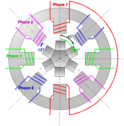 Va detto che non essendoci un campo magnetico rotante, il motore passo-passo a riluttanza è necessariamente a tre fasi.