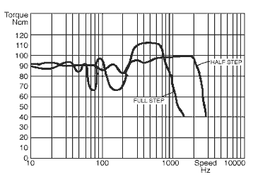 Nel grafico coppia-velocità noi vediamo una curva regolare. Le curve invece sono molto frastagliate e assi differenti nel dettaglio da motore a motore. Useremo un grafico dove si vede il funzionamento a un passo e mezzo passo in assenza di carico. Vediamo come nel funzionamento a un passo la coppia subisce marcate diminuzioni specialmente alle frequenze medio-basse; in alcuni punti la coppia subisce una diminuzione tale che il motore spontaneamente si ferma. Queste velocità vengono chiamate velocità a frequenze di risonanza (attenzione il fenomeno è meccanico).