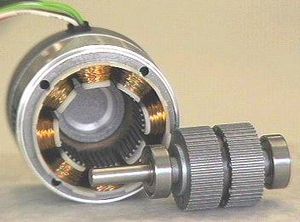 Ovviamente nel rotore non sono presenti ne cavi ne connessioni elettriche di alcun tipo ed è solidale allo statore, per mezzo di cuscinetti a sfera che ne assicurano la rotazione. Lo statore è simile a un motore a riluttanza con un pacco di lamierini avvolti dalle fasi statoriche, nelle espansioni polari. Lo sfasamento delle fasi statoriche risulta essere di un quarto di passo.