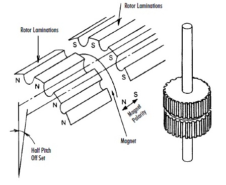 Ciascuna sezione è ruotata rispetto alle altre di 1/3 del passo dei denti: al cambio dell'alimentazione da una fase a un altra il rotore subisce lo spostamento di un passo che corrisponde a un 1/3 del passo dei denti.