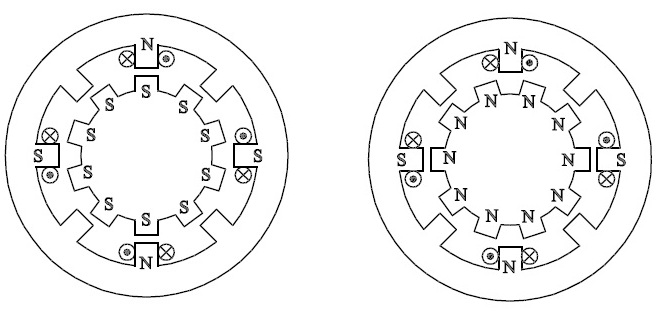 Si parla in questo caso di motori unipolari in quanto la corrente nella singola fase ha sempre lo stesso verso. La creazione di campi magnetici opposti avviene semplicemente scegliendo quale fase alimentare. Il numero di posizioni di equilibrio possibili dipendono dal numero dei denti del rotore e dai poli statorici. Tali posizioni vengono indicati come passi per giro.