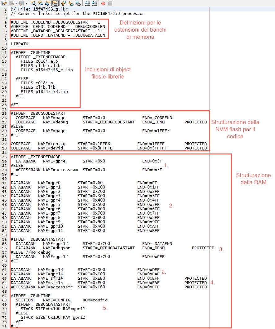 Partendo dalla directory di installazione del compilatore mplabc18 e spostandoci in ./dat/lkr/ troviamo, tra gli altri, il nostro linker script da analizzare/modificare: 18f47j53_g.lkr. Aprendolo nella IDE vedremo questo: