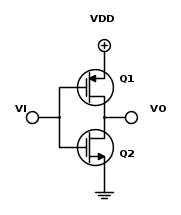 . Sarà invece l'NMOS (Q2) ad essere acceso con una VGSn > VTh, ma con una impedenza molto elevata sul Drain imposta da Q1 (rDSp) che si comporta come un circuito aperto. Quindi, in questa situazione, il circuito è analogo ad uno switch aperto (Q1) tra VDD ed una resistenza di pull-down (rDSn), con il terminale di uscita collegato al morsetto superiore di questa, con