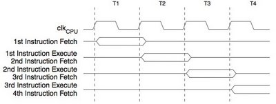 Nei microcontrollori AVR però sembra che qualcosa cambia, e di molto. Se per esempio andiamo a pagina 14 del datasheet del ATMEGA328p nella sezione Instruction Execution Timing osserviamo il seguente schema.