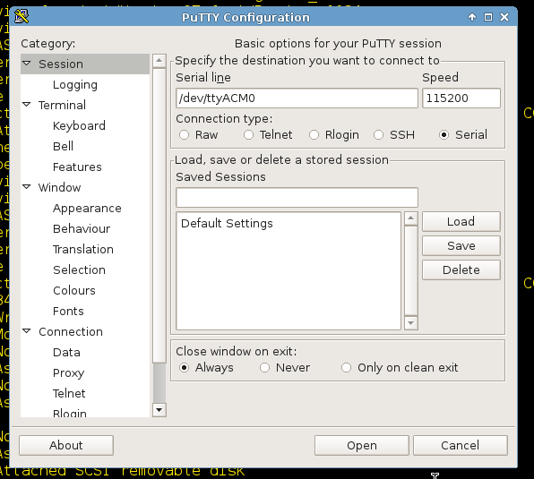 La velocità di comunicazione deve essere impostata a 115200, come si vede bisogna anche riportare il nome del dispositivo ttyACM0.