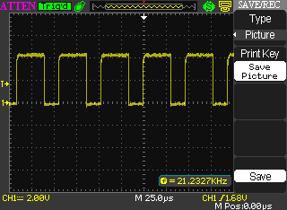, il quale è un risultato soddisfacente. A seguire possiamo osservare invece l'onda quadrata e la frequenza misurata tramite l'oscilloscopio