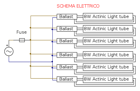 - Per lo schema interno avrei dovuto collegare tutti i ballast con ciascun tubo, in parallelo. Quindi lo schema di base sarebbe stato questo: