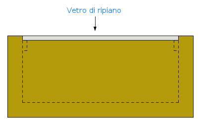 Per quanto riguarda il vetro di ripiano, come si vede o si può intuire dalla prima rappresentazione di questa sezione, ho fatto in modo che il ripiano di vetro rimanesse livellata e coincidesse con il bordo interno. Forse è meglio un'ulteriore rappresentazione: