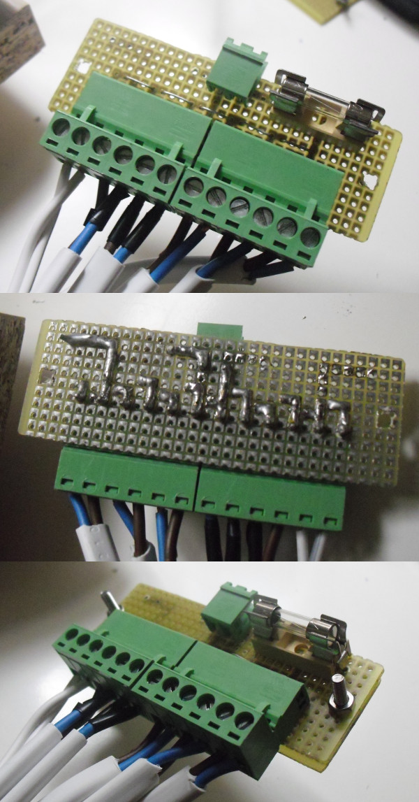 Si può anche notare come ho coperto le saldature inferiori con una basetta di dimensioni iguali, sostenendo le due basette con una vite e due dadi (per ciascun foro), uno che fa da spessore tra le due basette, e quello a vista per mantenere fermi ambe due.