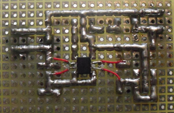 Ecco una immagine di un vecchio circuitino step-down con un MC34063 package SOIC-8 (8 pin Small Outline Integrated Circuit), con cui mi sono dovuto arrangiare con la tecnica del wire-wrap: