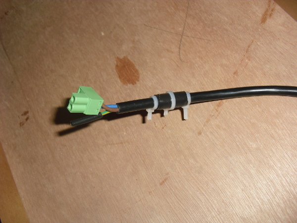 Qui sotto si può osservare come mi sono arrangiato con il connettore di rete: ho dato una bella passata di nastro isolante poco sotto il connettore, per poi stringere tre fascette. In questo modo, anche se si tira leggermente il cavo dall'esterno (io non ho intenzione di farlo ma non si sà mai) il cavo viene bloccato dalle fascette e dal nastro. Insomma, una specie di guarnizione.