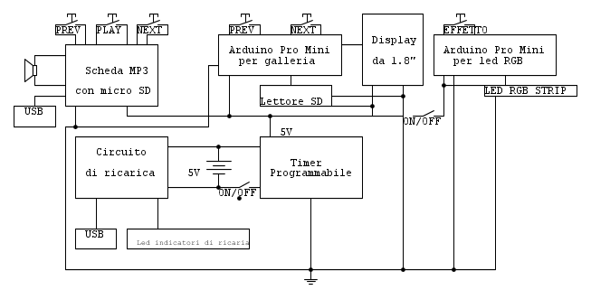 Purtroppo ho perso lo schema elettrico completo che avevo fatto su carta e non ricordo i collegamenti precisi, quindi riporto uno schema a blocchi giusto per rendere l'idea. Anche perché non ho fatto molto di più che collegare i vari componenti come suggeriscono i datasheet.