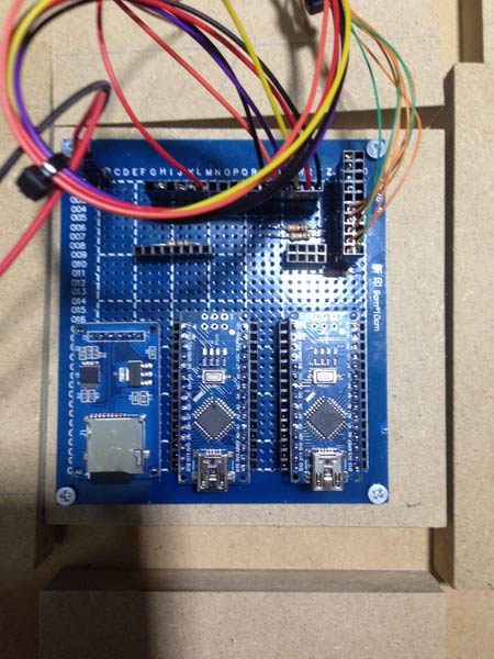 Ora come ora, un Arduino controlla la riproduzione delle immagini sul display e uno controlla le animazioni deii led posteriori per la lampada scaccia mostri che illumina il muro.