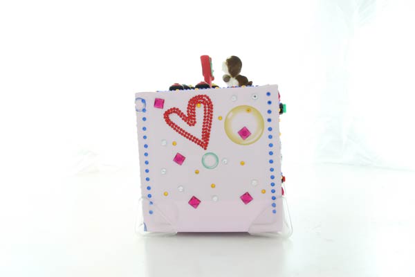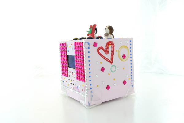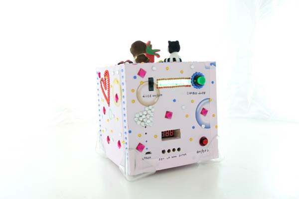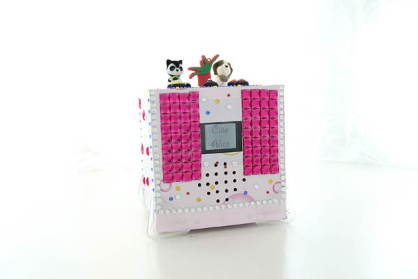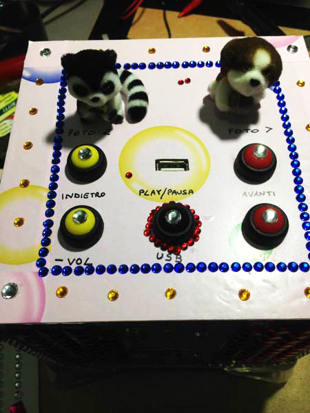 Anteprima del progetto finito - lato superiore: controlli MP3, controlli cornice digitale, USB per chiavetta con MP3 e pupazzetti decorativi.