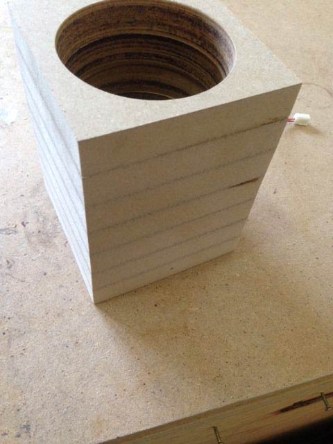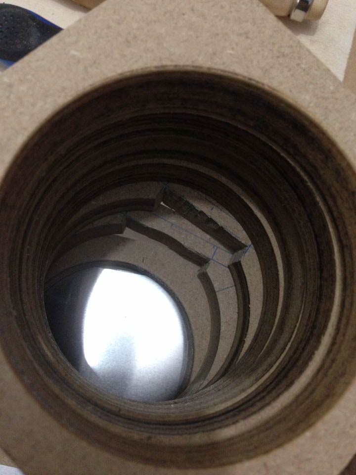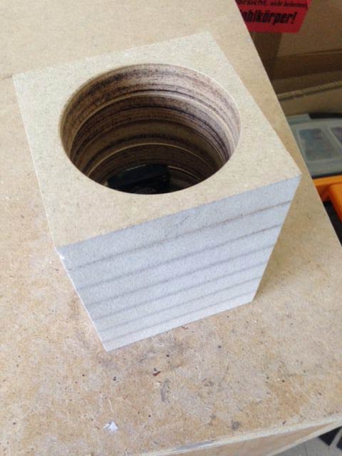 Ora è il momento di allineare i nostri 7 blocchetti forati di MDF ed incollarli con la colla vinilica (riusciremo mai più a dirlo senza pensare a Giovanni Muciaccia?). Cercate di essere precisi, ma probabilmente qualche millimetro, forando con la sega a tazza, l'avrete perso di qua e di la. Il mio consiglio è di allineare il meglio possibile i bordi esterni, perchè se i cerchi interni non sono proprio perfetti, non ci strapperemo le vesti.