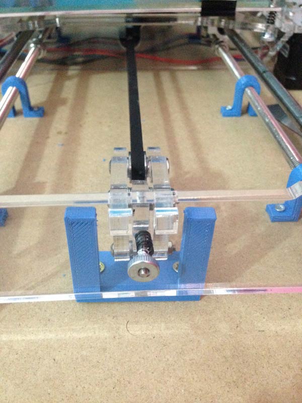 La stessa cosa vale per il tendicinghia della Y. Vi sarà utile un fermo che blocca l'acrilico in posizione. Fissatelo quando la cinghia è allentata e poi tendete la stessa. Scaricherete tutta la forza sul supporto e non sull'acrilico.