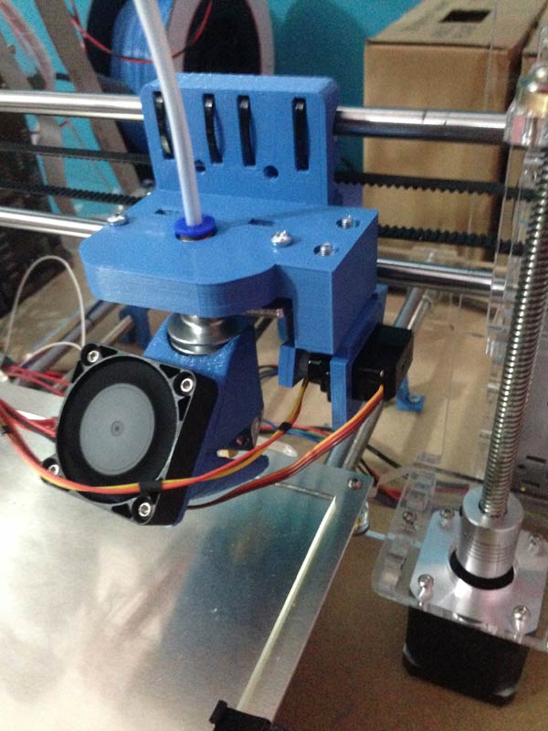 Poi, per stampare i materiali flessibili come il Ninjaflex, credo che costruirò un sistema di estrusione diretta. Di fatto, la stampante monta un estrusore chiamato Bowden, dove il motore spinge il filamento lungo quel tubicino bianco che vedete.