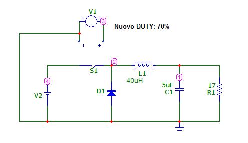 Metto L=40uH. MA in questo caso non sarei più con tensione di uscita medio = 6V in quanto tutta la trattazione fatta vale per un funzionamento continuo. Dovrei ritarare il duty per avere una uscita di 6V. Allora metto duty = 70% per avere ancora in uscita 6V medi (prova empirica con simulatore):