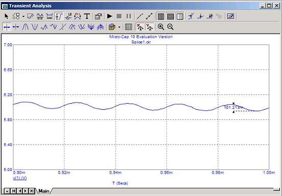 A parte il transitorio iniziale che sarà sempre oggetto di questo documento, si vede che una volta raggiunto il regime stazionario abbiamo la corrente nell’induttanza (curva rossa) triangolare e la tensione in uscita (curva blu) che è la tensione sul condensatore, centrata intorno ai 6 V. Faccio notare che la tensione sul condensatore dovrebbe essere formata da archi di parabola in quanto l’intergale della corrente che è triangolare.