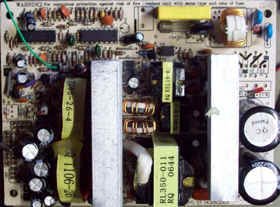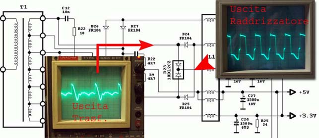 Come si nota dallo schema elettrico, non e' presente il filtro 'EMI poiche' alcuni produttori per risparmiare sul costo di produzione, lo eliminano aggiungendo dei ponticelli laddove sarebbero dovuti essere montati i componenti.