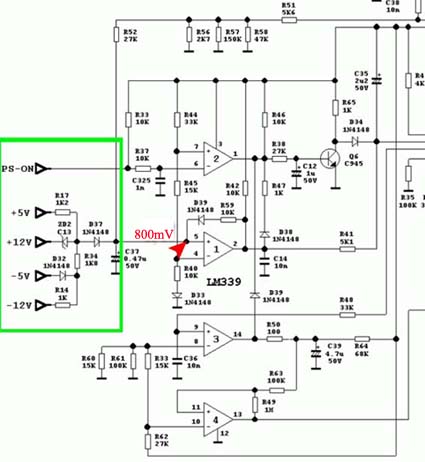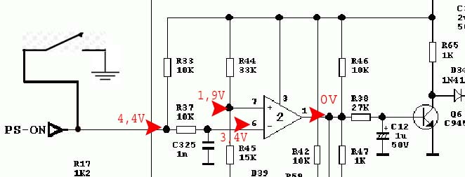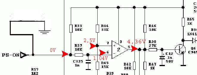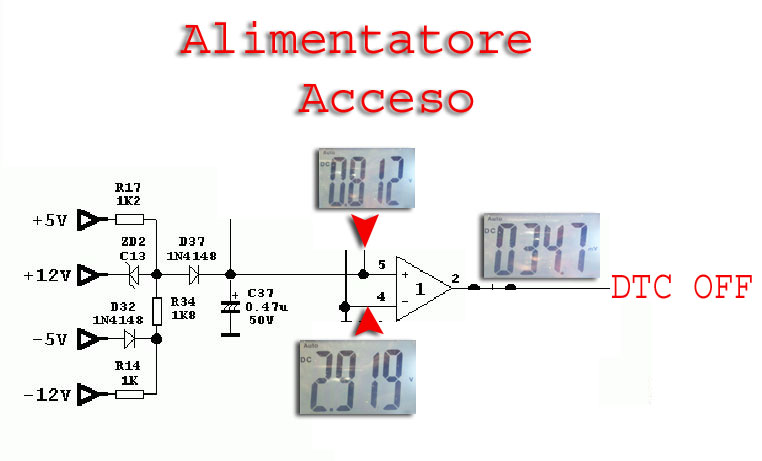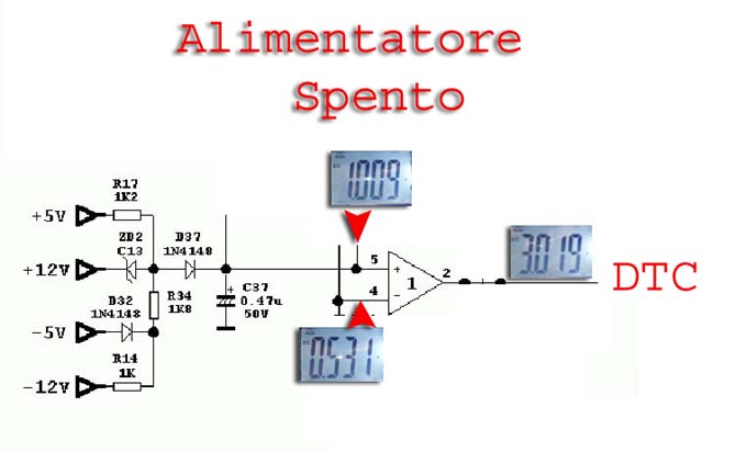 Quando chiudiamo l'interruttore il partitore viene chiuso a GND e sul piedino 1 avremo un uscita a livello alto circa 4,6V Questa uscita a livello alto dell'operazionale, comandera' il DTC(come vedremo piu' avanti)a lasciare spento l'alimentatore.