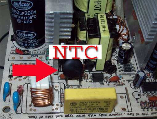 NTC sta per coefficiente termico negativo. Quando non e' percorso da corrente elettrica la sua resistenza interna e' alta e quando accendiamo l'alimentatore, la corrente iniziale di spunto e' molto alta, quindi la sua funzione e' di limitarla all'accensione. Dopodiche' quando i due grossi elettrolitici hanno raggiunto la carica completa,la resistenza percorsa da corrente si scalda per effetto Joule e si riduce in modo esponenziale fino a far passare tutta la corrente.