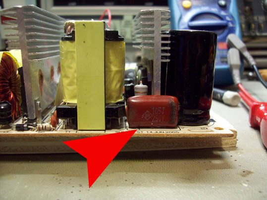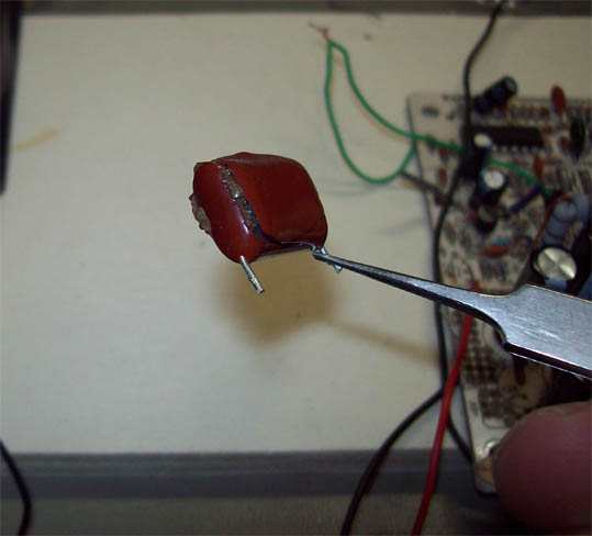 A questo punto prendete in considerazione che molte volte a causa di uno sbaglio,se il selettore e' posizionato a' 115 volt e lo alimentiamo a 220 V il condensatore visibile in foto diventa cosi: