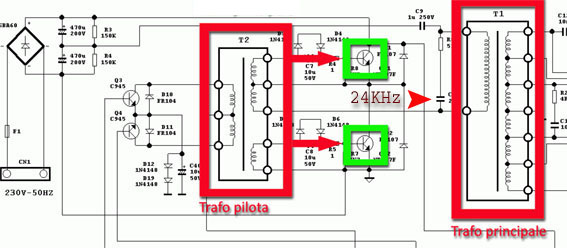 Dallo schema si puo' vedere il pilotaggio dei due transistor Q3 E Q4