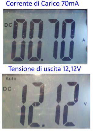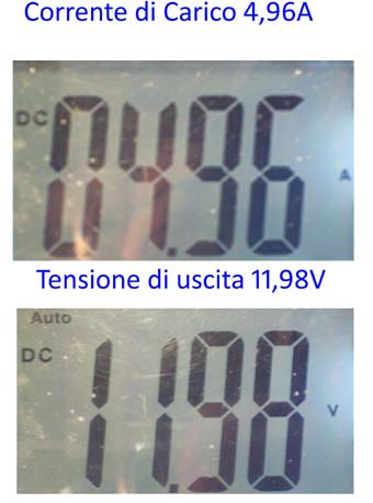 Al'inizio con la semplice lampadina avremo una tensione di: 12V con un carico di 5W, in seguito inserisco un carico di circa70W.