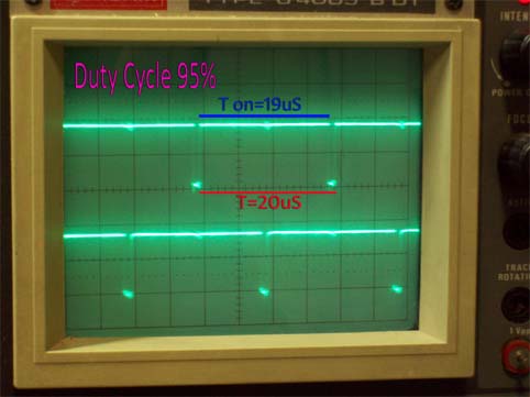 Senza nessun carico applicato,il tempo di Ton e' del 95% questo significa che in uscita avremo una tensione massima di circa 13V: