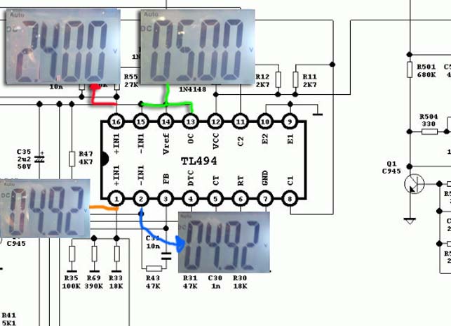 Come si nota dalla tensione di 2,4V con un carico basso e una tensione di 2,2V con un carico Alto al piedino 16 non invertente. Con questo sistema e' possibile controllare e proteggere l'alimentatore da una sovracorrente oppure limitare la tensione massima di funzionamento.