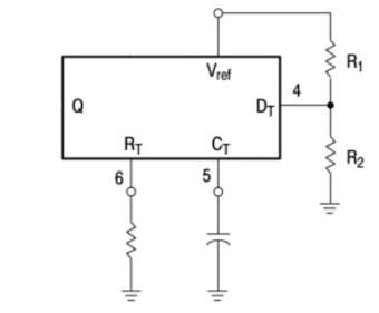 Se sul piedino 4 facciamo variare una tensione compresa tra 0 e 3V possiamo regolare il duty cycle. Quando invece e' presenta una tensione prossima allo 0V il DTC si trova al minimo, ovvero permette un'escursione che va dallo 0% al 45%. Se invece la tensione e'maggiore > di 3V il DTC è al massimo, ed il duty cycle non salirà oltre allo 0%.