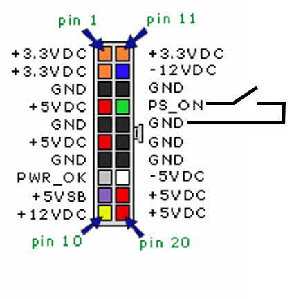 Prima di passare alla fase successiva bisogna cortocircuitare a massa il PS_ON altrimenti l'alimentatore non si avvia. E' un cavetto di colore verde.