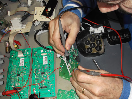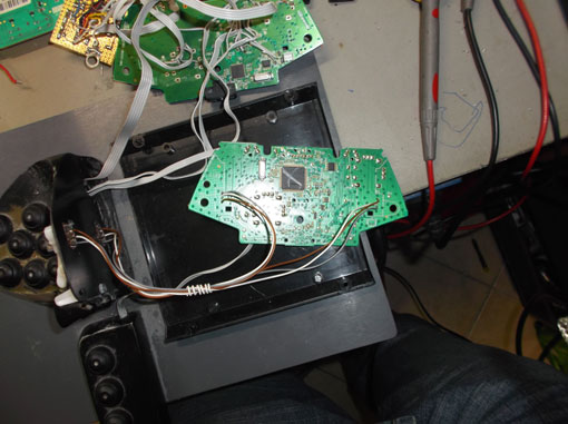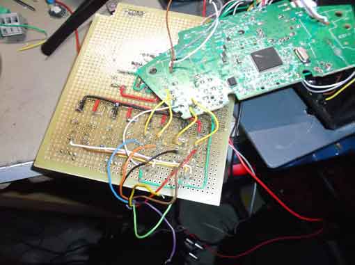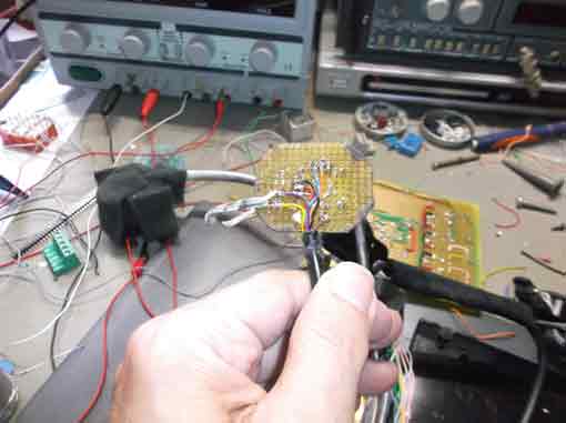 Una prima difficolta' e' stata quella di non trovare piazzole di saldatura per il PCB wireless. Le piste erano veramente troppo sottili, ed i Vias molto delicati. Così attraverso un ingranditore e con tanta pazienza ho dovuto grattare le piste per poter saldare i nuovi fili. Iniziano i primo collegamenti per le prove.