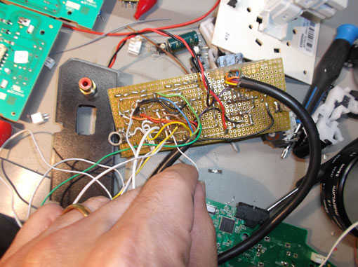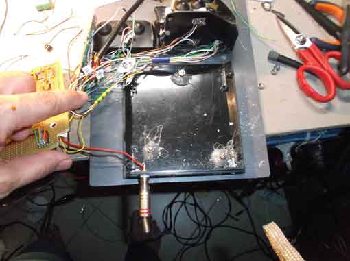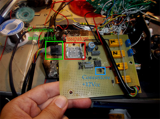 Tralasciando altri dettagli che avrebbero allungato il brodo dell'articolo, sono passato direttamente alla fase del montaggio. Il PCB su millefori non era del tutto definitivo,ed e' stato cambiato diverse volte lo schema del cablaggio. Si vede anche l'immagine del mini connettore che collega il mini joystick alla staffa.