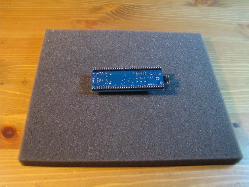 - Si ribalta la scheda in modo da poter saldare il componente e qui iniziano i problemi. A meno di non avere una fortuna sfacciata, il componente cercherà di uscire dalla sua posizione o almeno di allontanarsi da essa. La prima cosa che verrebbe in mente di fare è tenerlo contro la basetta con un dito (che sarà inevitabilmente ustionato) mentre con le altre dita si tiene la scheda. La mano destra tiene il saldatore e ... la terza mano aggiunge il filo di stagno per la saldatura. Oltre al rischio ustione c'è un problema: c'è una mano di troppo, non va bene. Un sistema è quello di appoggiare un pezzo di gommapiuma (magari recuperato da un' imballaggio) sopra i componenti, ribaltare la scheda e semplicemente premerla. La gommapiuma manterrà i componenti aderenti al circuito stampato ed in questa situazione si procederà a saldare.