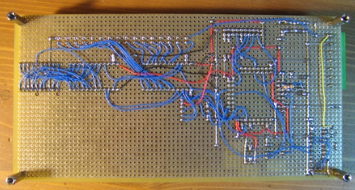 I protoipi filati si realizzano utilizzando delle piastre preforate chiamate "millefori". In pratica si saldano i componenti sulla basetta e si effettuano i collegamenti con spezzoni di filo sottile o con filo nudo stagnato. Io uso i reofori recuperati perchè vanno bene a fare le barre di alimentazione ma sopratutto di massa e del filo per wire-wrap perché è sottilissimo e non è da spellare. Appena lo si appoggia allo stagno la guaina si ritira scoprendo l' anima di rame stagnato. Questo è un prototipo realizzato su millefori.