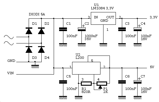 Per generare i 3,3V ho usato un regolatore in grado di erogare fino a 5A, non tanto perche' ce ne sia bisogno ma perché ... costano poco ed avere una buona corrente non e' mai un male. In questo modo posso alimentare diversi circuiti contemporaneamente circuiti senza problemi. Per il 5V ho usato un L200 che è in grado di fornire fino a 2A di corrente. L' alimentatore prevede l' ingresso di una tensione alternata da un trasformatore o da una sorgente in continua da regolare. Per il collegamento fra l' alimentatore e la scheda di sviluppo utilizzo dei semplici connettori per scheda a cui saldo i fili. Questi semplici connettori sono visibili nella parte destra della basetta. Preferisco usare questo sistema perché in questo modo posso saldarne diversi, utilizzare sempre gli stessi cavetti per il collegamento e collegare e scollegare velocemente piu' schede.