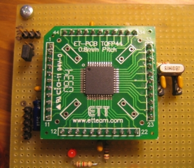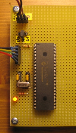 La foto mostra il dettaglio della scheda dove ho montato il micro. Sulla destra c'è il quarzo con i due condensatori montati sullo zoccolo, in alto a sinistra il connettorino a 3 vie per l' alimentazione e, sul lato destro, il connettore per il programmatore/debugger. Sotto al connettore dell' alimentazione si trova il jumper che ho inserito per scollegare il micro dall' alimentatore. In basso il mio solito LED rosso per tenere sott' occhio l' alimentazione.