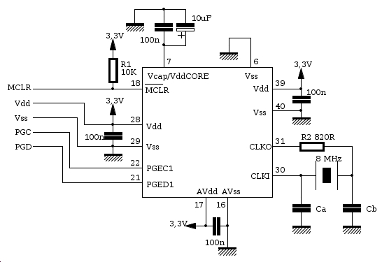 Per la realizzazione dello schedino su cui svilupperò la mia applicazione ho fatto riferimento ad un paragrafo del datasheet intitolato "Guidelines for getting started with 16-bit digital signal controllers". Il titolo è molto chiaro ed il paragrafo fornisce utilissime informazioni per iniziare. Innanzi tutto mostra uno schema e delle indicazioni per il collegamento minimo del micro indicando quali alimentazioni collegare per farlo funzionare e i vari condensatori di filtro necessari per evitare problemi. In particolare c'è un piedino indicato come "Vcap/Vddcore" che è estremamente importante e non va assolutamente collegato alla Vdd. Infatti è l' uscita del regolatore interno del micro e l' hanno messo per essere collegato ad un condensatore di filtro da 10uF al tantalio. Non avendo condensatori al tantalio l' ho collegato al parallelo di un condensatore elettrolitico con un condensatore ceramico da 100nF. Il piedino di MCLR (il reset del micro) serve anche al programmatore/debugger. Nelle specifiche del PicKit3 e dell' ICD3 (quello che uso io) è scritto di non collegarci nessun condensatore o diodo e che una resistenza da 10K è sufficiente per un buon funzionamento. Quindi, vada per la 10K verso la Vdd! Questo è lo schema dello schedino di sviluppo.
