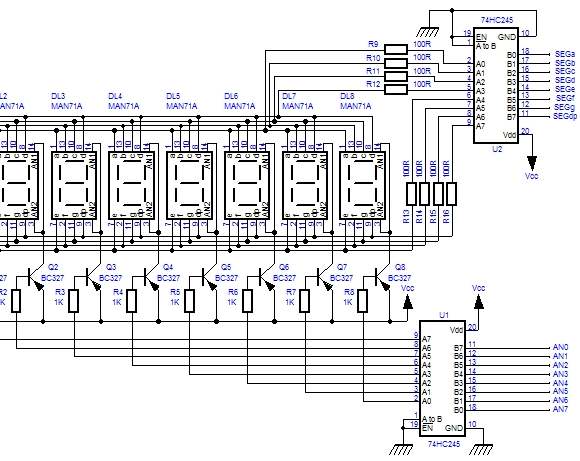 Lo schema elettrico qui sotto è un classico esempio di come vengono collegati i displays per realizzare un visualizzatore multiplexato a 8 digit (se ne vedono di meno perchè l' immagine è tagliata). Si tratta una basetta che ho costruito per sviluppare un' applicazione con una logica programmabile. Ho dovuto inserire dei buffer perché la CPLD che usavo non è in grado di pilotare direttamente i display ma analizzandola si capisce bene il principio di funzionamento. Gli otto display sono ad anodo comune con tutti i segmenti dello stesso nome collegati insieme. Per far comparire un "1" nel display DL8 si imposta il dato sulle linee che vanno da SEGa a SEGdp (rispettivamene a 10011111, lo zero attiva il segmento) che, per così dire, collegheranno i segmenti (catodi) a massa attraverso le resistenze da 100R, poi si comanda il transistor Q8 mandando a livello 0 la linea AN7. Attraverso la resistenza R8 il transistor Q8 andra' in saturazione collegando di fatto tutti gli anodi dei 7 segmenti all' alimentazione. Il display si accende ed indica il numero "1".