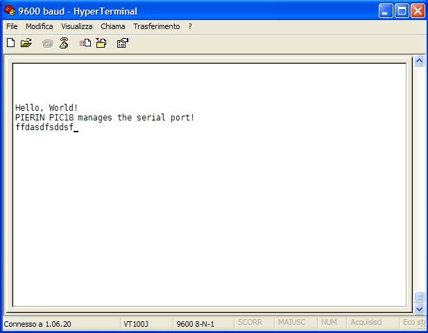 Lo scopo di questo programma è quello di illustrare l' inizializzazione minima della EUSART1 del microcontrollore, utilizzare le funzioni di output su stdout della libreria standard del C stdio.h, ed infine realizzare la funzione di echo sulla seriale.