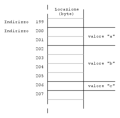 Un esempio aiuterà a chiarire la cosa. Supponiamo di avere tre valori diversi che chiameremo a,b e c, e che a occupi 2 byte, b ne occupi 4 e c ne occupi uno solo. Supponiamo anche che possono essere memorizzati a partire dall'indirizzo 200. Avremo questa situazione