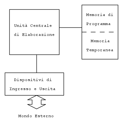 Un PC, un telecomando gestito da un micro, o una centralina d'iniezione per un auto sportiva, sono in pratica la stessa cosa: macchine che eseguono programmi, sono calcolatori, detti anche computer. Ed anche la loro struttura è sostanzialmente la stessa. E questa è una bella notizia perché ci fa risparmiare tempo ed energie. Una rappresentazione molto semplificata (ma utile e necessaria) potrebbe essere questa.