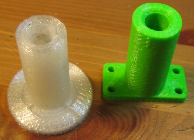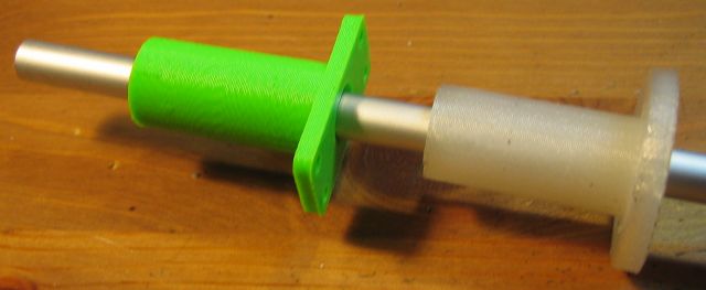 Quella trasparente è in PLA mentre quella verde è in ABS. Ho disegnato le due boccole con il diametro del for da 9,5 mm. per poi rifinirlo con una punta mediante il trapanino a colonna. Pensare di ottenere un diametro sufficientemente preciso senza rilavorare il pezzo è un' idea da scartare. Una volta realizzati i pezzo ho portato il diametro (9,2 mm. ed abbastanza irregolare) a 10 mm. Con il PLA ho dovuto faticare perché la punta tendava ad impastarsi e fare attrito. Ho dovuto ripassarla diverse volte usando un lubrificante. Con l' ABS è stato decisamente più semplice ed il risultato ottenuto è stato migliore. Il gioco è inferiore e la rilavorazione è stata molto più facile.