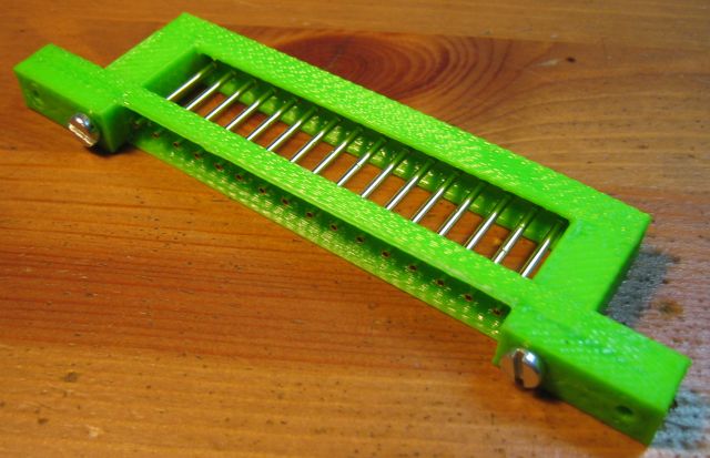 Su questi telaietti verranno anche fissati oggetti come questo, composto da due particolari tenuti insieme da due viti, che sostengono 16 ricettacoli per i pin di test a molla.