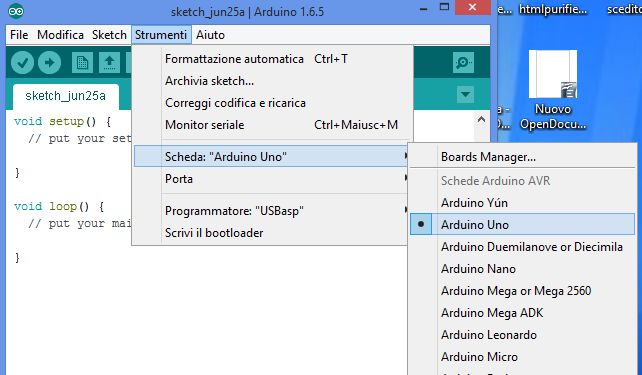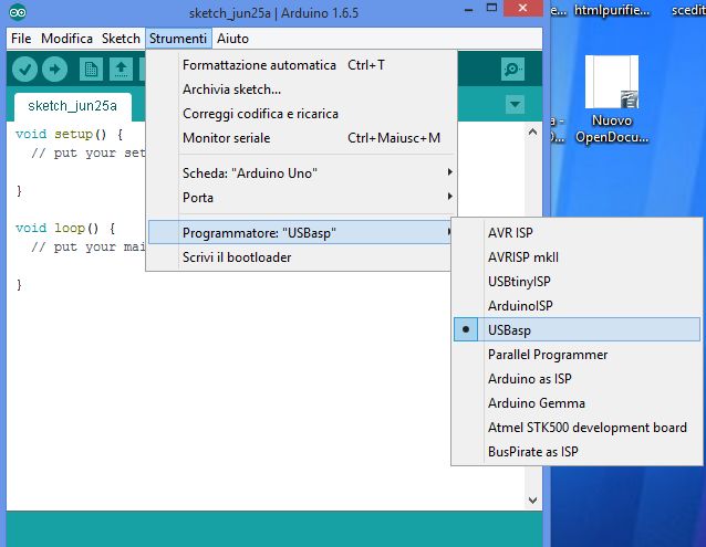 Per poi scaricarlo nella scheda è sufficiente selezionare USBasp ATmega328P nel menù Tools ed in un batter d'occhio vedremo il nostro LED lampeggiare.