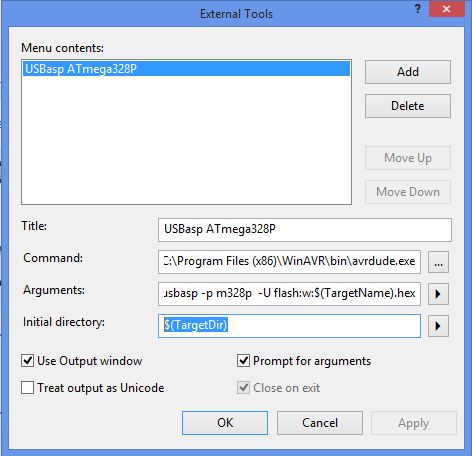 - Nel campo Arguments scriviamo -V -c usbasp -p m328p -U flash:w:$(TargetName).hex. Attenzione! se un giorno volessimo programmare un micro differente dovremo cambiare l' ozione -p m328 (che sta per Atmega328) con un altra. Ad esempio se volessimo in futuro programmare un ATmega324 dovremmo scrivere -p m324. Consultare la documentazione di avrdude per la lista dei dispositivi.